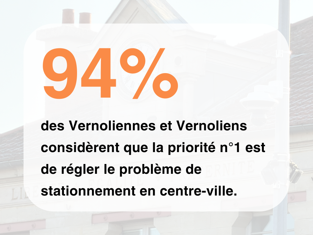 - 94% des Vernoliennes et des Vernoliens considèrent que la priorité n°1 dans la ville est de régler le problème de stationnement en centre-ville.