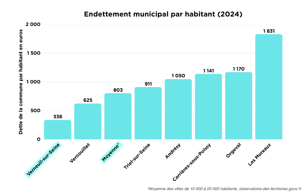 À Verneuil, les taux fonciers communaux n’ont pas changé depuis 20 ans. De 2001 à 2020, avant notre élection, le désendettement de la ville n’était permis que via un immobilisme politique et la bétonisation de notre commune.